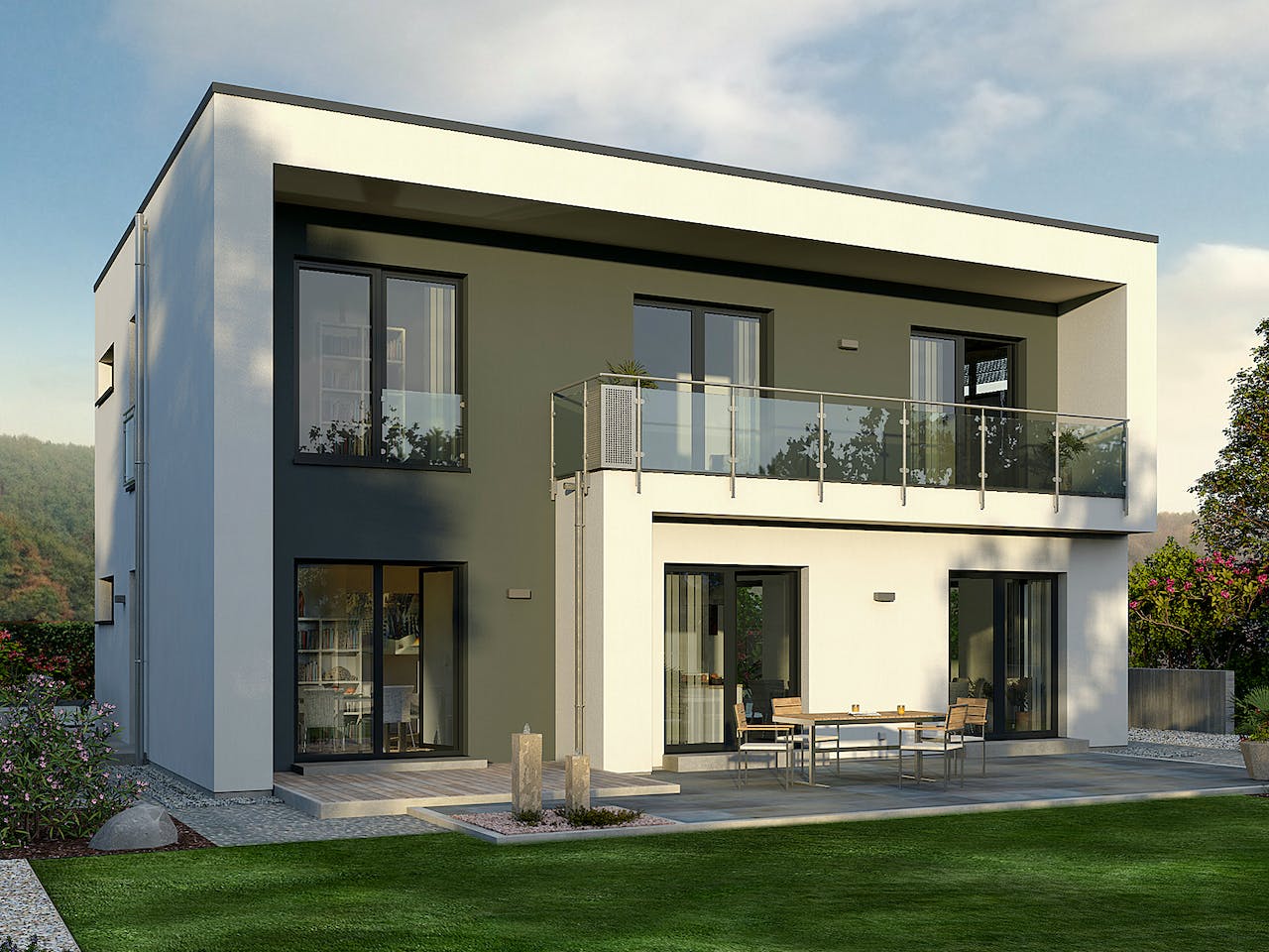 Unser Haustyp Cult 5 bietet eine beeindruckende Vielfalt und Flexibilität. Mit seinem modernen Kubusdesign und Flachdach ist das Haus ein echter Blickfang. Der große und lichtdurchflutete Wohn- und Essbereich öffnet sich durch zwei Zugänge direkt zur Terrasse, um drinnen und draußen zu verbinden. Ein Hauswirtschaftsraum, ein Gäste-WC und ein Arbeitszimmer vervollständigen den modernen Komfort dieses Hauses. Im Obergeschoss erwartet dich ein großzügiger Elternbereich mit eigenem Badezimmer. Drei weitere Zimmer bieten ausreichend Platz für Kinder oder Gäste.