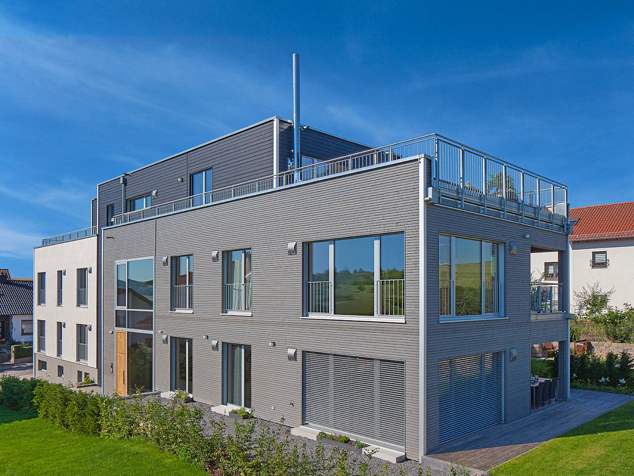 Dieses baubiologisch wertvolle Mehrfamilienhaus mit sieben Wohneinheiten entstand in Rheinhessen zwischen Worms und Alzey, direkt am Weinberg gelegen. Der Grauburgunder wächst hier quasi vor der Haustür. Die Bauherren legten auf eine Wohnform Wert, die maximale Privatsphäre bietet und zugleich ungezwungene Begegnungen mit den Nachbarn ermöglicht. So gelang das Kunststück, die Qualität eines Einfamilienhauses auf ein Mehrfamilienhaus zu übertragen und das „Spargelgrundstück“ in leichter Hanglage optimal zu nutzen. Der gestalterische Ansatz war es, die wirtschaftlichen und ökologischen Vorteile zu verknüpfen und dabei ein hohes Maß an Privatheit, vor allem auch in den Außenbereichen zu schaffen. Entstanden ist ein T-förmiger Kubus, der mit einer horizontalen Holzverschalung in zwei Grautönen und einer weißen Putzfassade kombiniert ist.