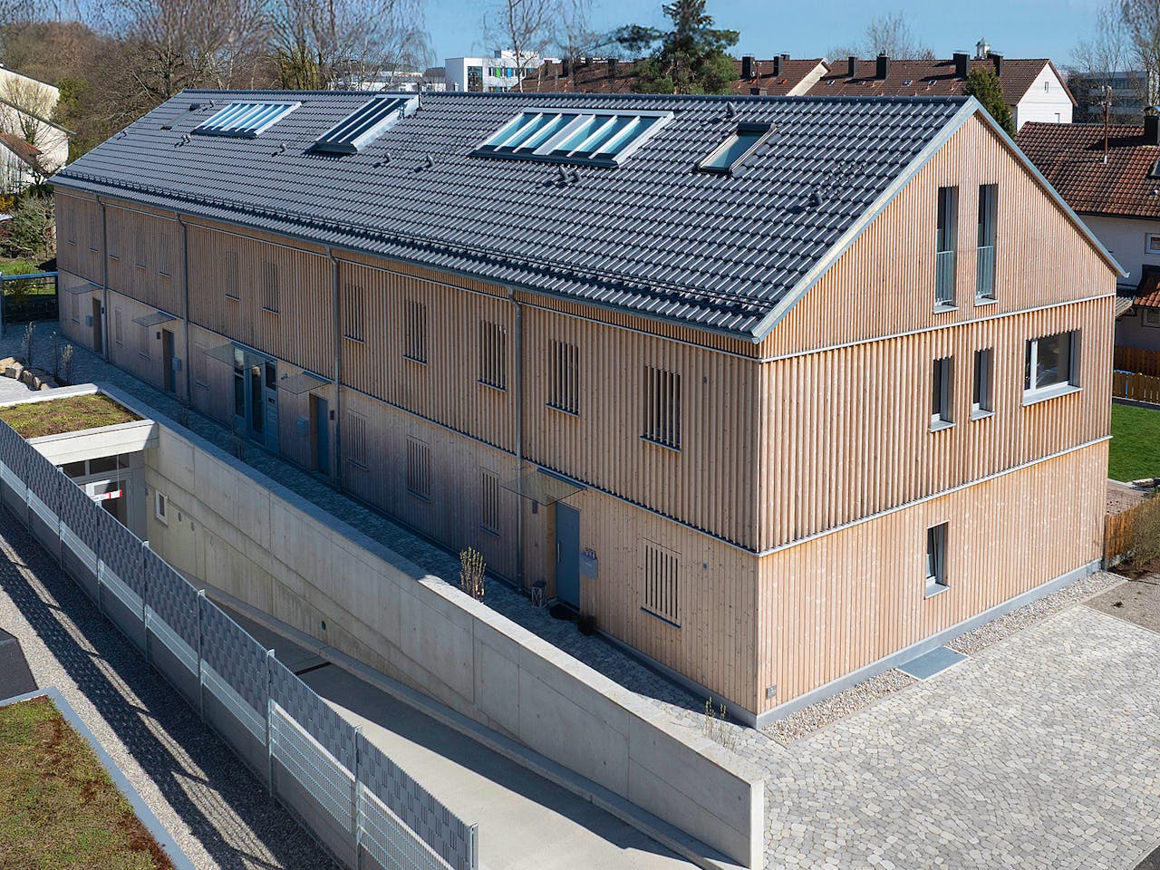 Was tun mit einem großen Grundstück mit Altbau mitten in der Stadt, wenn die einst so hübsche Villa in die Jahre gekommen ist und nur noch von einer Person bewohnt wird? Renovieren war keine Option, eine Teilung nicht möglich. Für die Familie Häberle, Mutter Erika und zwei erwachsene Söhne, war klar: Wir bauen ein Mehrfamilienhaus auf diese Fläche. Geplant wurde mit 10 Wohneinheiten, im Ergebnis das 20-fache an Wohnraum auf dem gleichen Grundstück: Wo vorher Frau Häberle allein gewohnt hat, können nun rund 20 Menschen leben. Das neue Mehrfamilienhaus ist als Dreispänner mit Kellergeschoss und Tiefgarage mit je zwei Stellplätzen pro Wohnung angelegt. Alle Wohnungen sind mit speziellen Wohnungstrennwänden und -decken voneinander separiert, für optimale Schalldämmwerte und entsprechend hohen Schallschutz. Die ursprünglich vier Wohnungen im Obergeschoss und die zwei Dachgeschosswohnungen teilen sich ein gemeinsames mittiges Treppenhaus mit Podesttreppe und Aufzug vom Keller bis ins Dachgeschoss. Kleine Besonderheit: Selbst das Treppenhaus und der Aufzugschacht sind in Holzmassivbauweise ausgeführt. Und: Zwei der Wohnungen wurden noch in der Produktionsphase dank Zwischentür zu einer Wohnung.