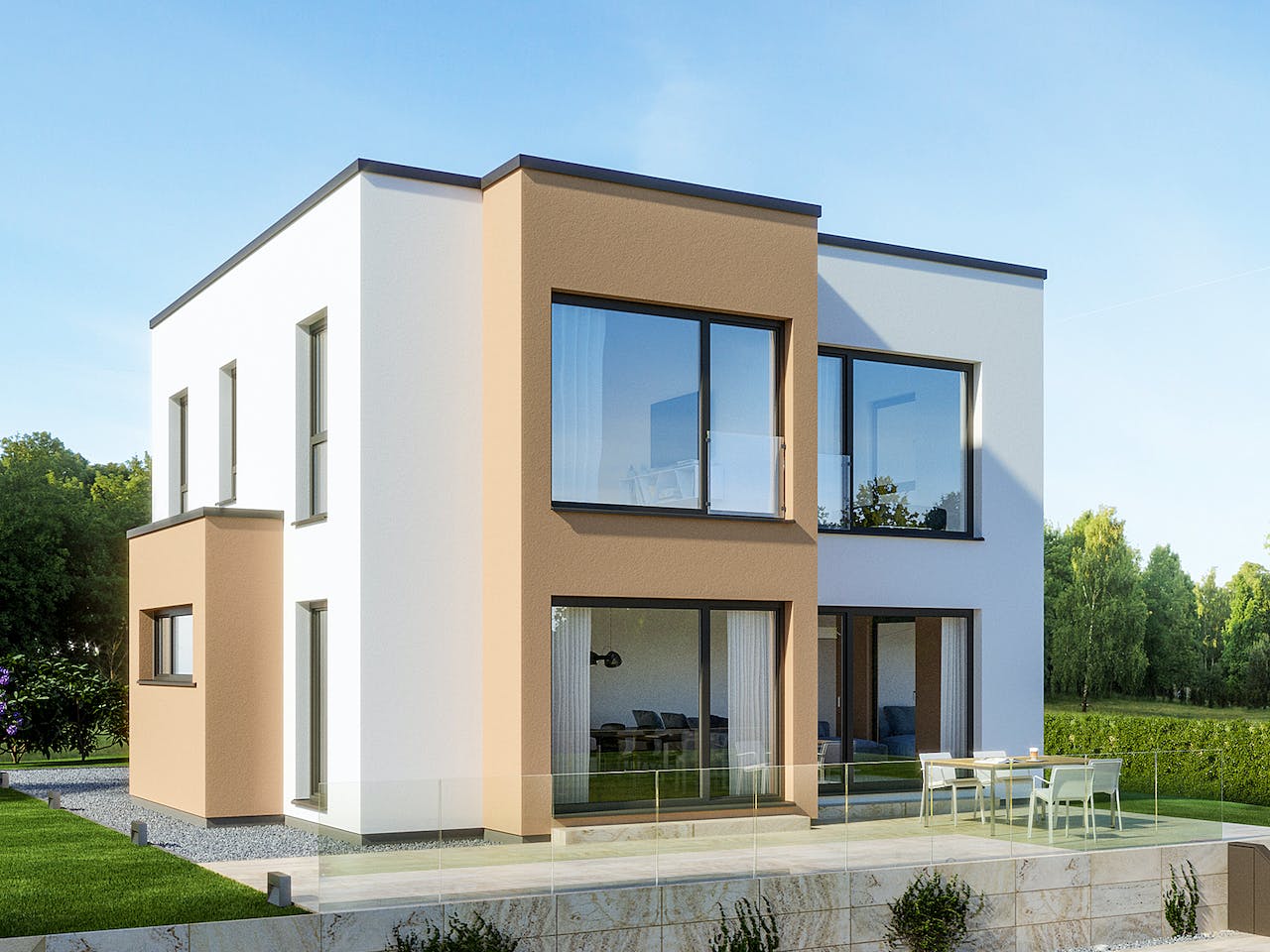 Modernes Flachdachhaus mit 2-geschossigem Panorama-Erker und Rechteck-Erker