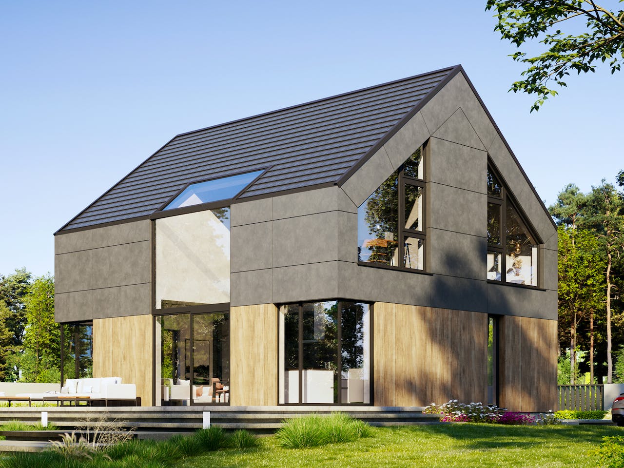 Veredelt wird die Gesamtkomposition des Hauses durch einen eleganten Materialmix der Fassade und dem modern minimalistischen Satteldach ohne Dachüberstand, im Innern durch hochwertige Hölzer oder Wandgestaltungen.