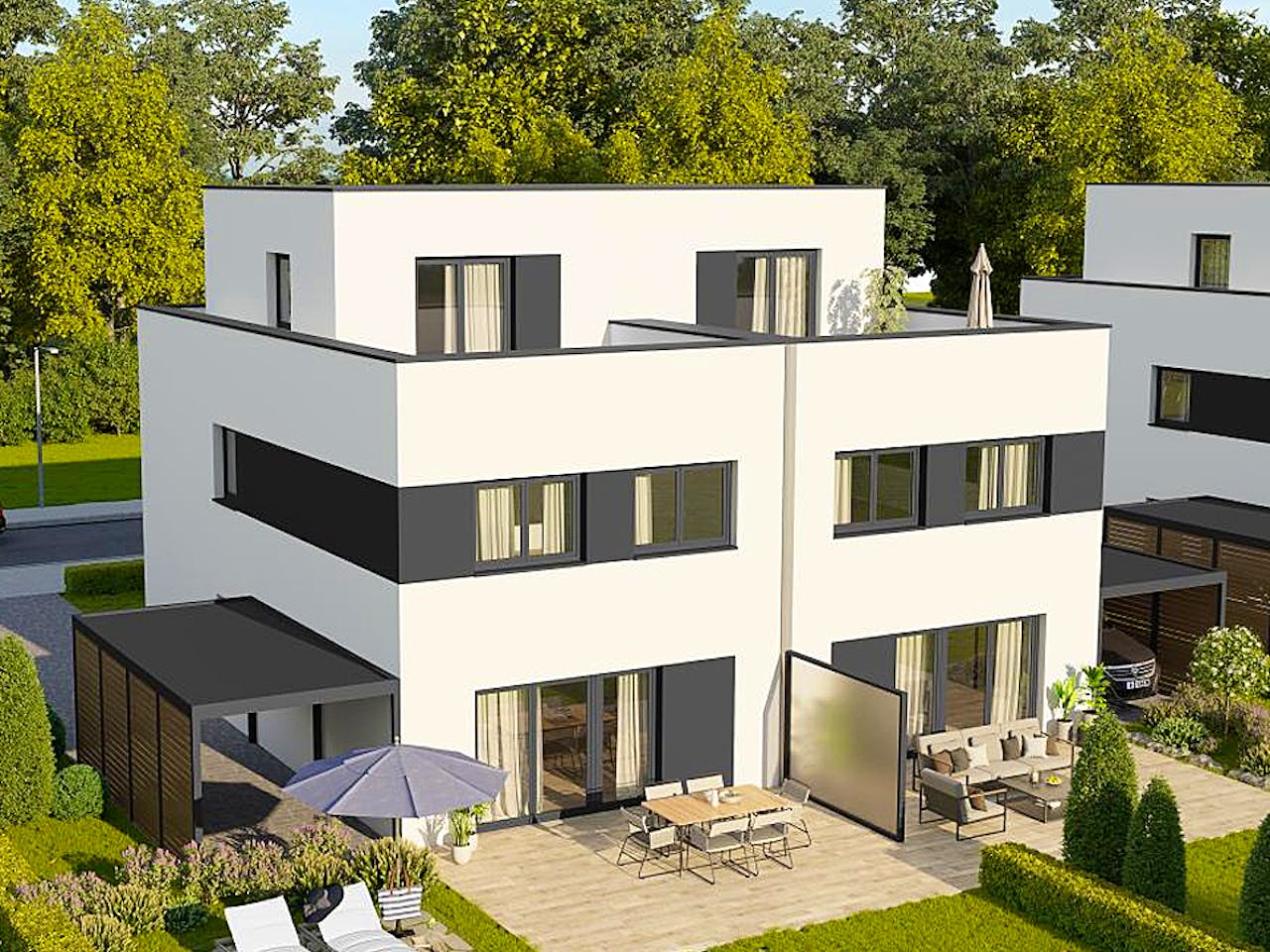 Ein Haus, das Träume erfüllt: Das ist Finesse 166! Denn das Haus ist außen ebenso individualisierbar wie innen. Und das fängt schon beim Eingang an – von vorne oder seitlich versetzt mit einer überaus markanten Optik heißen die Alternativen. Drinnen macht der Wohn- Essbereich mit modern integrierter, offener Küche Pluspunkte, im Obergeschoss ist Platz für zwei Kinderzimmer, Bad und Schlafzimmer. Das Studio im Staffelgeschoss ist vielseitig nutzbar. So hat es genügend Platz für ein Büro oder auch ein Gästezimmer. Ein großer Dachgarten setzt architektonische Akzente.