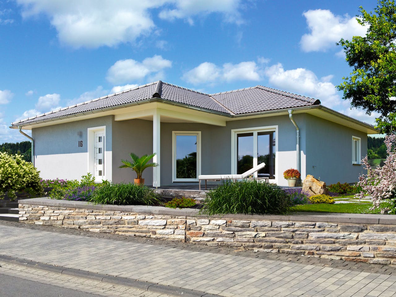Klar strukturierter Grundriss und gemütliches Wohnen auf 119m². Von der Galerie aus gelangen Bewohner und Besucher in den offenen Wohn-, Ess- und Kochbereich. Von hier aus gibt es einen direkten Zugang zur Terrasse. Im linken Teil des Hauses eröffnet sich der Schlafbereich. Hier ist Platz für ein Schlafzimmer, ein großes Badezimmer und einen weiteren Raum. Dieser ist beispielsweise als Kinder-, Arbeits- oder Gästezimmer nutzbar. Der schöne Bungalow bietet alles was das Herz begehrt und macht komfortables Wohnen auf einer Ebene möglich.