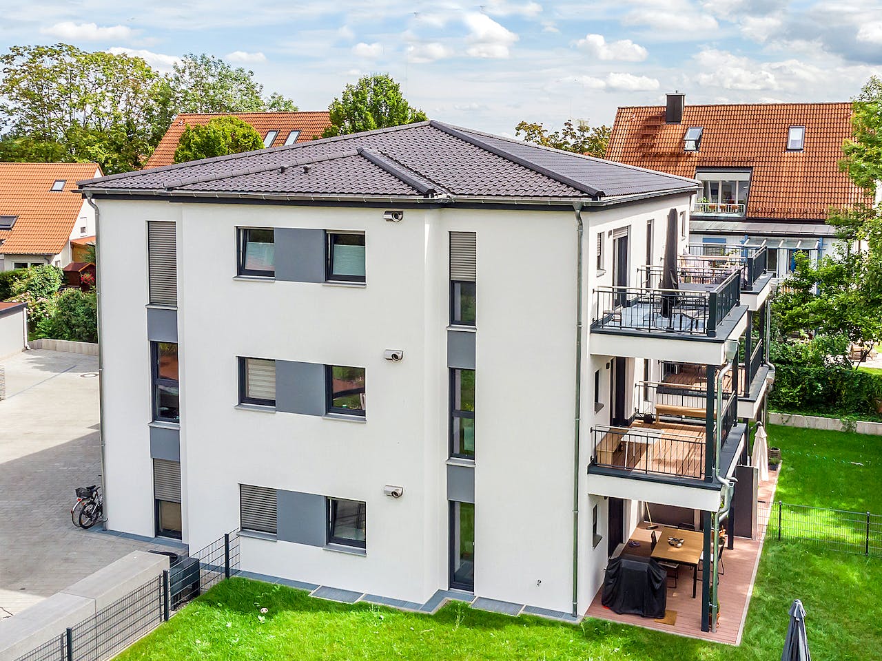 Dieses moderne 6-Familien-Haus in Dachau glänzt durch seine vorausschauende Bauweise und Vielfältigkeit. Drei identische 2-Zimmer-Wohnungen, zwei größere 4-Zimmer-Wohnungen und eine 3-Zimmer-Wohnung finden in dem modernen Baukörper Platz. Durch die Aufspaltung in der Mitte des Gebäudes verfügen alle sechs Parteien über einen Zugang zu einem großen eigenen Balkon oder einer Terrasse für die Erdgeschosswohnungen. Um die Badezimmer, die mit Dusche und einer separaten Badewanne ausgestattet sind, optimal zu nutzen, befindet sich im Keller ein Hauswirtschaftsraum mit 6 Waschmaschinenanschlüssen für die jeweiligen Wohnungen.