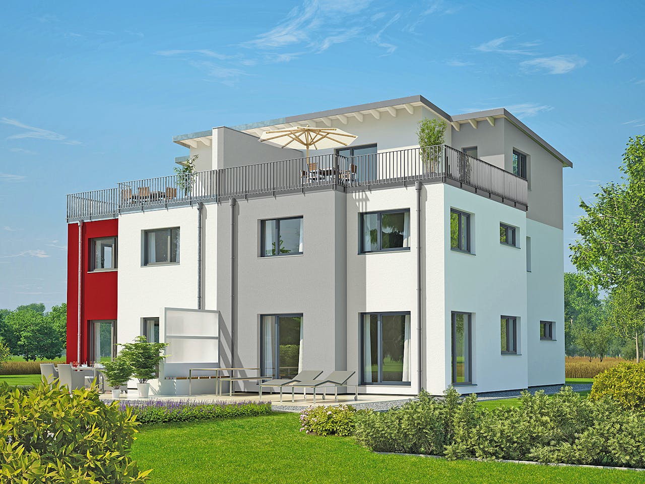 Wer die Vorteile eines Doppelhauses nutzen möchte, aber nicht auf zeitgemäße, moderne Architektur verzichten mag, für den ist das Doppelhaus 144 die perfekte Wahl. Klare Linien und viel Glas bestimmen den ansprechenden Charakter des kubischen Flachdachhauses. Optional kann das Haus mit einem gestaffelten zweiten Obergeschoss mit Pultdach erweitert werden. So entsteht nicht nur eine großzügige Dachterrasse mit herrlichem Ausblick, sondern auch ein z. B. als Arbeitszimmer, Heimkino oder Hobbyraum nutzbares Studio.