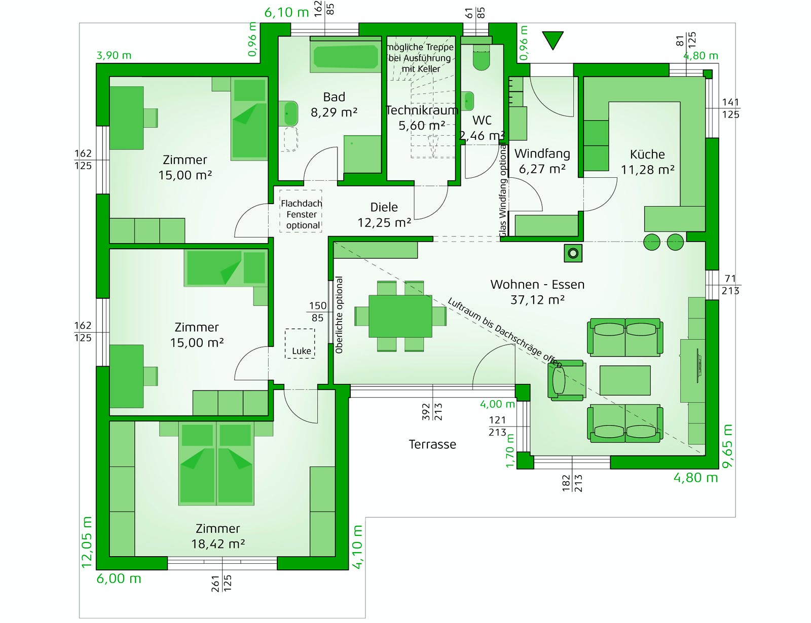 Passen Sie den Grundriss an Ihre persönlichen Bedürfnisse an und besprechen Sie Ihren individuellen Plan mit einem Bauberater des Anbieters.