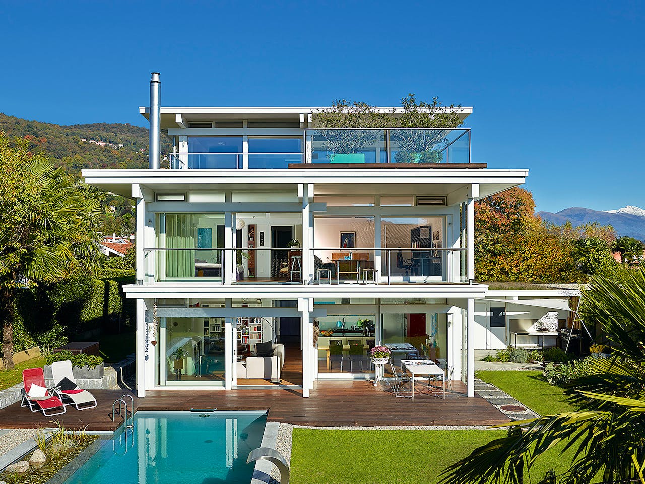 Lichtgestalt aus Holz und Glas: Nur wenige Gehminuten vom Luganer See entfernt befindet sich dieses schmucke Fachwerkhaus von HUF HAUS in traumhafter Lage im Süden der Schweiz. Für die Bewohner ein wahrer Glücksgriff, denn sowohl die schneebedeckten Gipfel der Alpen als auch die saftig grünen Palmen im Garten sind von der großzügigen Dachterrasse aus bestens einsehbar.
