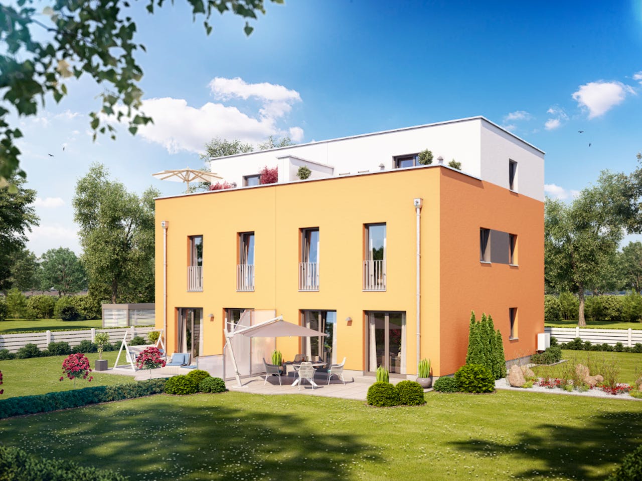 Dieses Traumhaus lässt keine Wünsche offen und besitzt echten Wohlfühlcharakter. Auf der rund 9 qm großen Dachterrasse können Sie laue Sommerabende ausklingen lassen und die Aussicht genießen. Auch von außen ist das Doppelhaus durch seinen modernen Grundriss ein echter Hingucker.