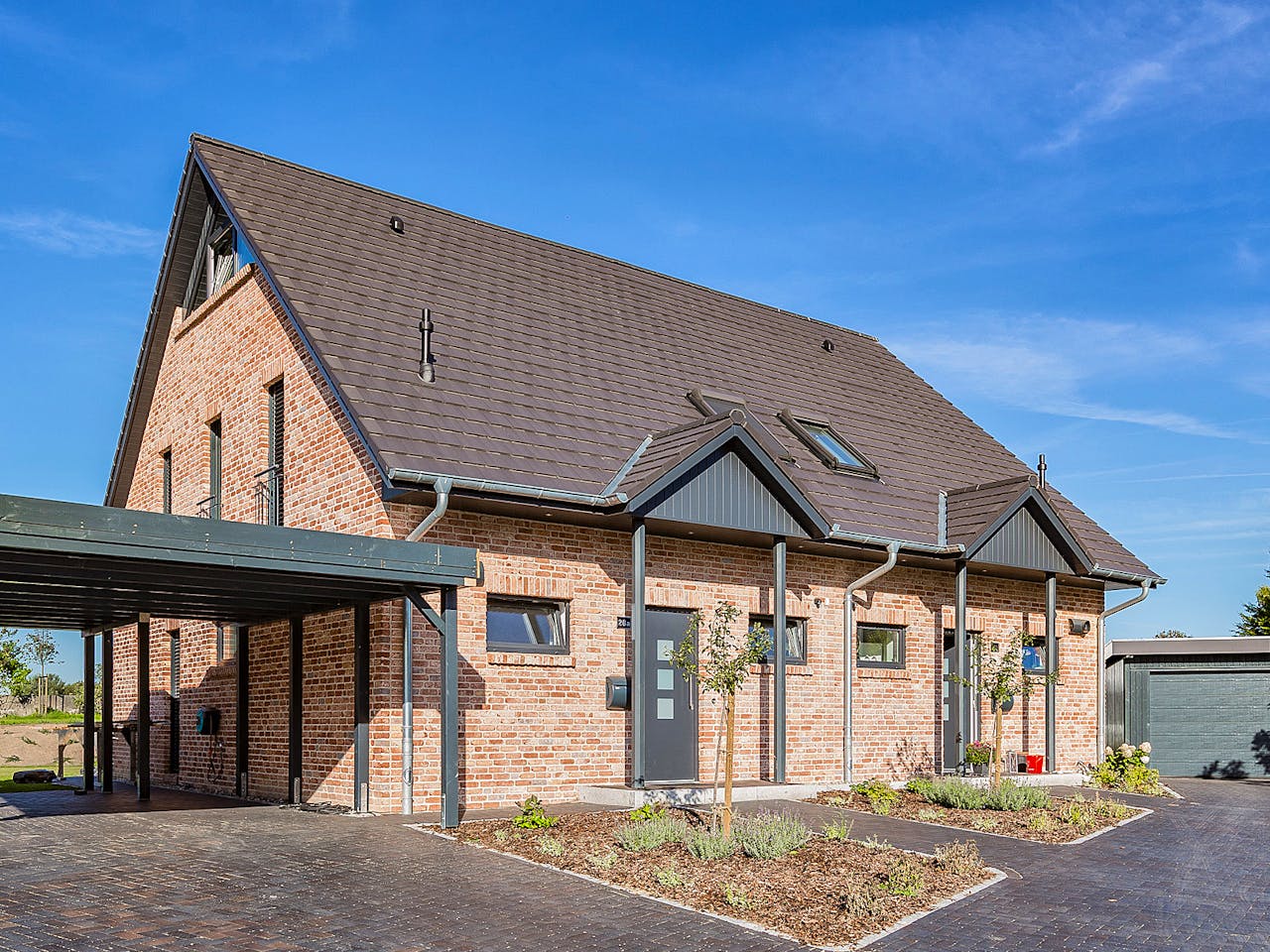 Diese Doppelhaus besticht durch seinen nordischen Charme mit Kapitänsgiebel und einer schönen eingangsüberdachung, auch der Grundriss kann natürlich wie bei allen Häusern noch auf 2 Kinderzimmer angepasst werden, im Wohnzimmer mit einer großen Hebeschiebetür damit mehr Platz vorhanden ist