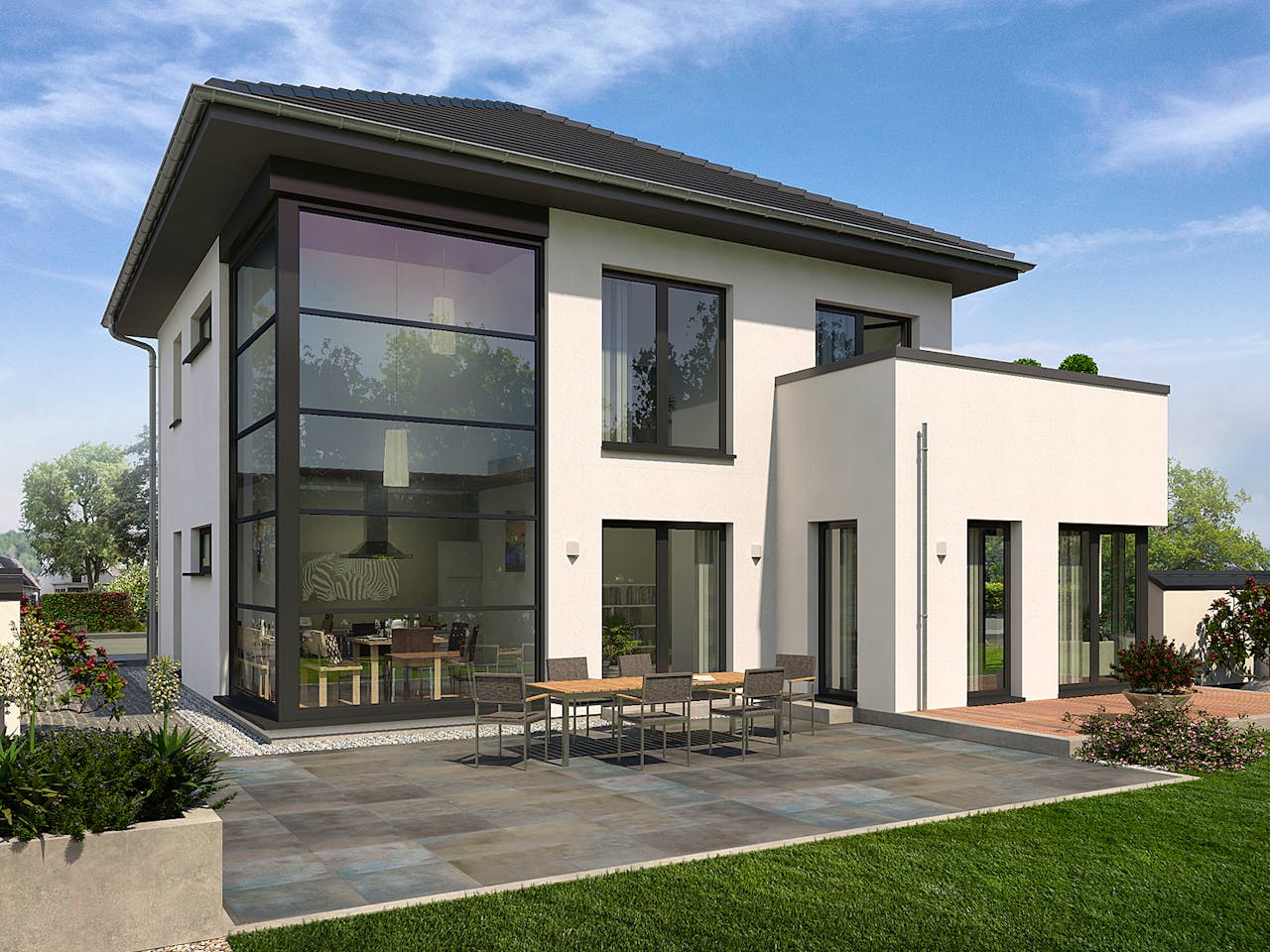 Die zweigeschossige Stadtvilla mit Zeltdach und Erker-Anbau präsentiert sich in schnörkellosem Design. Eyecatcher hier: die 5 Meter hohe Eck-Glasfront. Das Wohnkonzept steht für Offenheit und Transparenz und gewährt gleichzeitig ausreichend Privatsphäre.