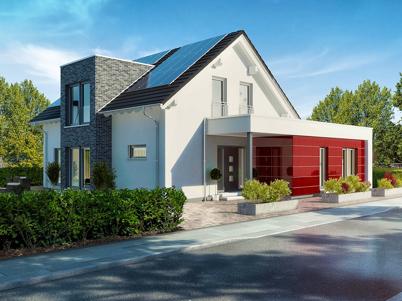 Der Studioausbau der Zimmer und Galerie erreicht eine Deckenhöhe von bis zu 3,50 m. Bei der Außengestaltung wurde die klassische Bauweise durch das verklinkerte Zwerchhaus und die rote Glasfassade gekonnt komplettiert. Und wer zieht mit ein?