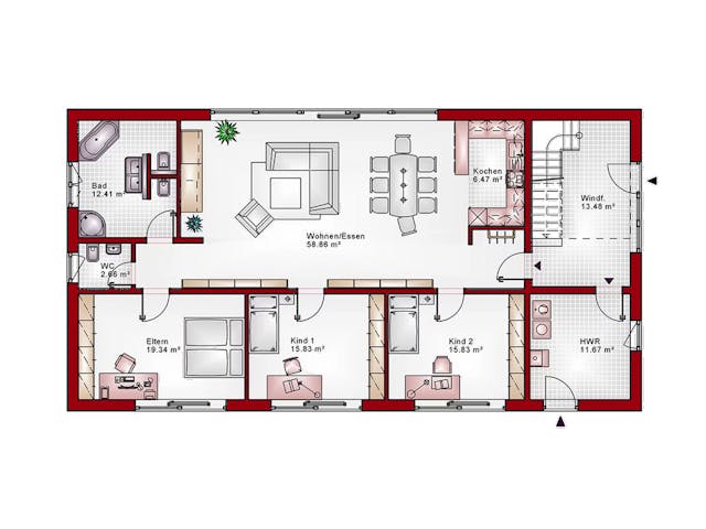 Passen Sie den Grundriss an Ihre persönlichen Bedürfnisse an und besprechen Sie Ihren individuellen Plan mit einem Bauberater des Anbieters.