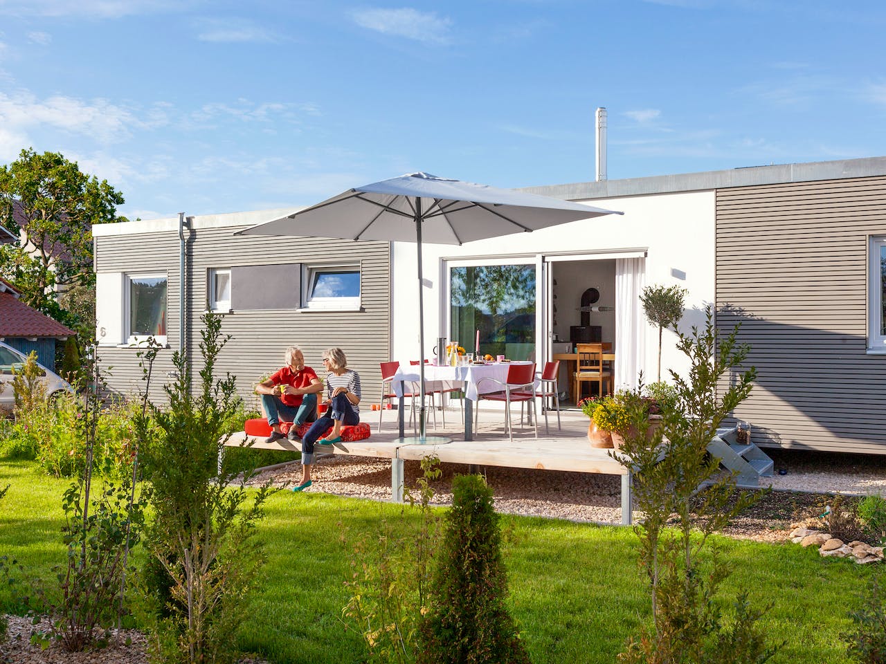 Ehepaar Kohler fühlt sich in ihrem Minihaus auf 50 Quadratmetern Wohnfläche sehr wohl. Die notwendige Reduktion des Haushalts auf das im Vergleich zu ihrem vorherigen Familienhaus sehr viel kleinere Platzangebot empfinden sie als Befreiung. Von ihrer gemütlichen, mit Holzdielen gefassten Terrassenplattform schaut das Ehepaar Kohler ohne Bedauern auf das 150 Quadratmeter große ehemalige Familienhaus mit der blauen Holzfassade am anderen Ende des Gartens, in dem nun der älteste Sohn Moritz mit seiner Familie wohnt.