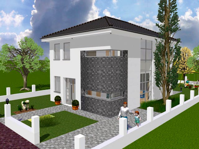 Zwei Attribute prägen das Simple mit den auffälligen Eckfenstern: modern und dennoch geradlinig. Das ein schnörkelloses Haus nicht langweilig sein muss, zeigt schon die mögliche Fassadengestaltung. Die Highlight in dem 115 m² Haus, sind die großen Lichtbänder, welche Essbereich und Treppenhaus gleichzeitig mit viel Tageslicht versorgen. Inkl. Bodenplatte und Luft-Wasser-Wärmepumpe mit Fußbodenheizung - Keller optional.