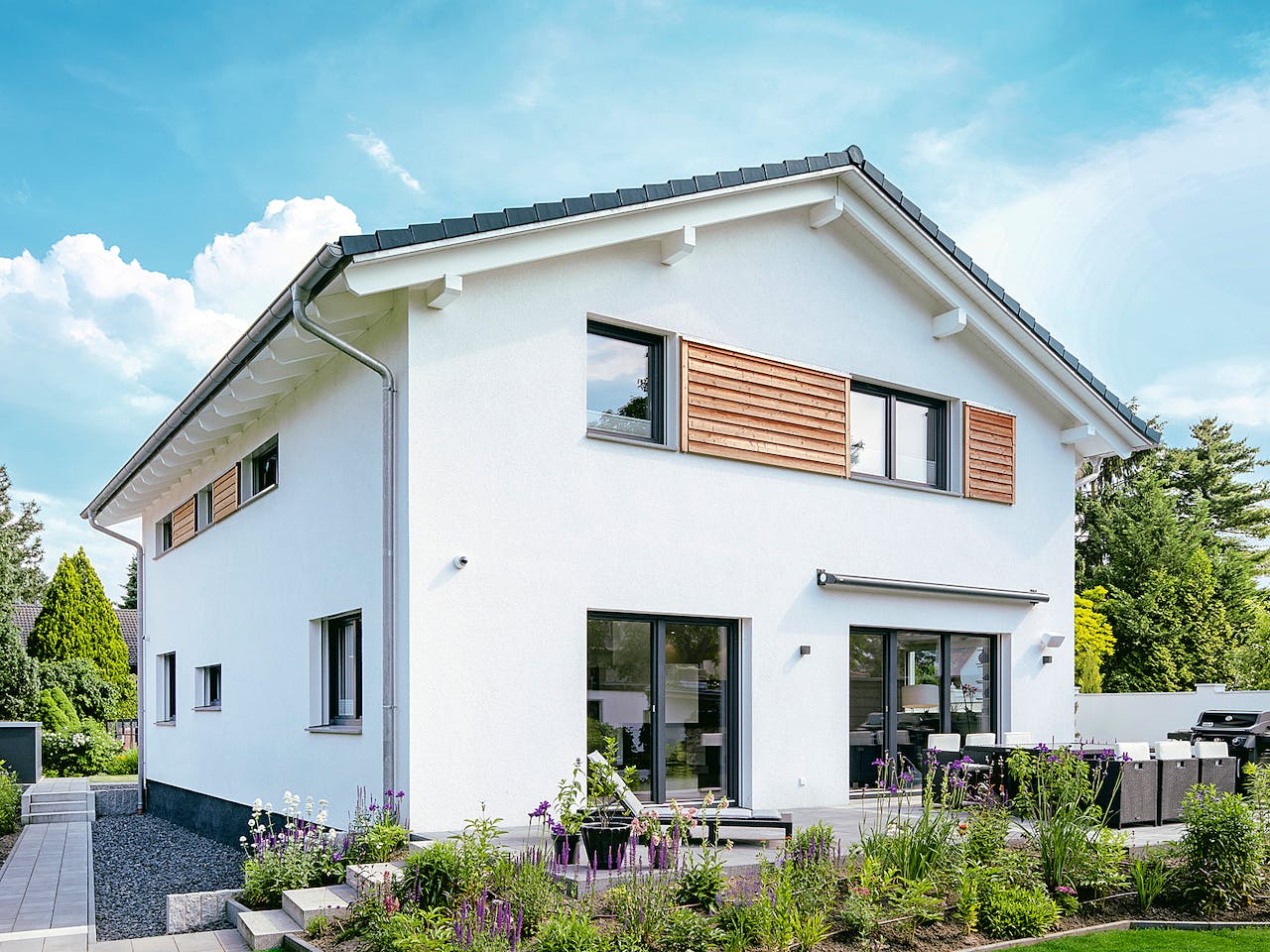 Das frei geplante Architektenhaus von Familie Greve ist perfekt auf das Grundstück in Berliner Stadtnähe zugeschnitten. Holzelemente und graue Fensterrahmen lockern die ansonsten weiße Fassade des anderthalbgeschossigen Eigenheims auf. Auch bei den Ziegeln des Satteldachs hat sich das Ehepaar für Grau entschieden, wodurch ein harmonisches Gesamtbild entsteht. Ergänzt wird das Einfamilienhaus von einer Doppelgarage und große Fensterfronten auf der Rückseite eröffnen den Blick in den Garten.